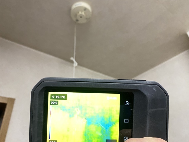 赤外線で見ると、屋根に部分的に温度差があり、水分の滞留であると考えれます。